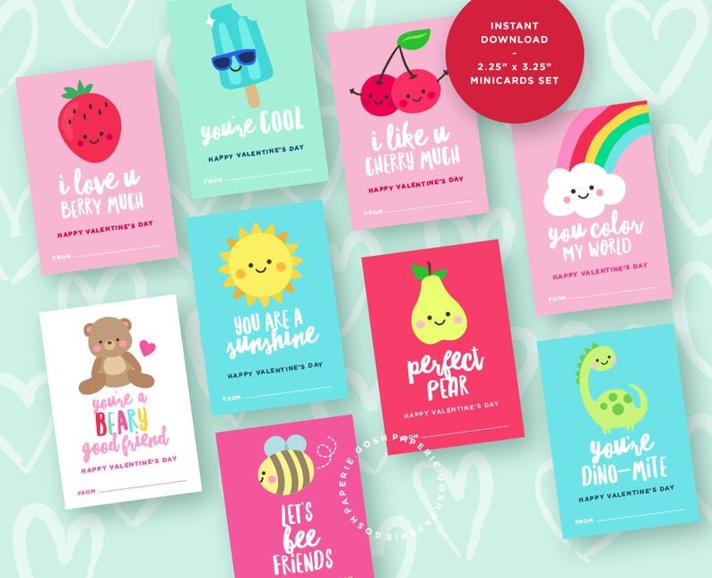 Check out some of our favorite picks for printable Valentines from some amazing Etsy vendors. There are so many playful designs, there is bound to be a perfect one for your child’s interests (space, mermaids, food, silly, even Hamilton inspired valentines!). These are all just a few dollars and can be printed at cut out at home. Click on photos for more information: