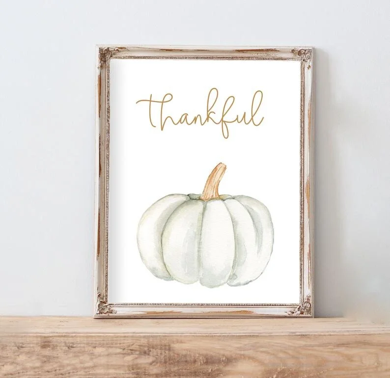 I purchased three graphics, the watercolor pumpkins & floral printable design, the Gather Wreath (kind of comical in 2020, I know) and the “Let our lives be filled with both thanks and giving”saying sign. Instead of cutting them out, I just chose adjust the size to 8 X 10, print and frame them in inexpensive, gray frames from Target.