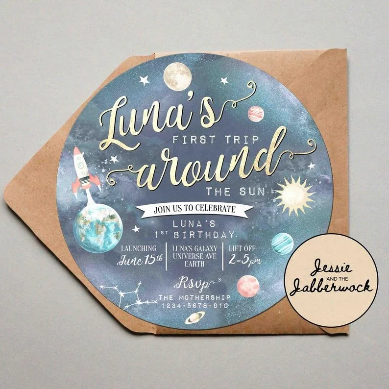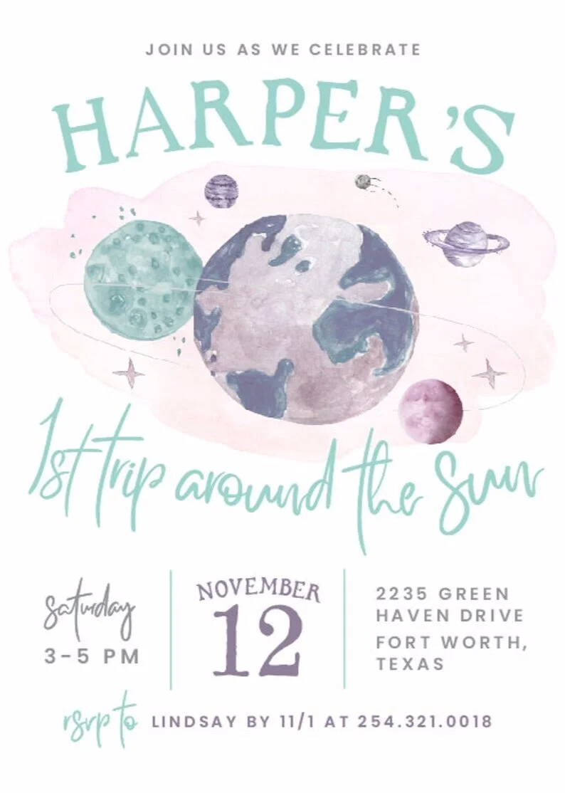 The First Trip Around the Sun customized Birthday Party pieces are from Prettiest Print Shop on Etsy. Hailey mentioned they were great to work with and were open to making color changes to the design to fit with her sunnier vision. The shop has a collection of adorable things, but Hailey selected the customized Printable Outer Space Backdrop Poster and had it printed at Costco. She also had used the Outer Space High Chair Banner, Outer Space Birthday Cupcake Toppers, First Trip Around the Sun Stats Poster, and First Trip Around the Sun Birthday Invitation.