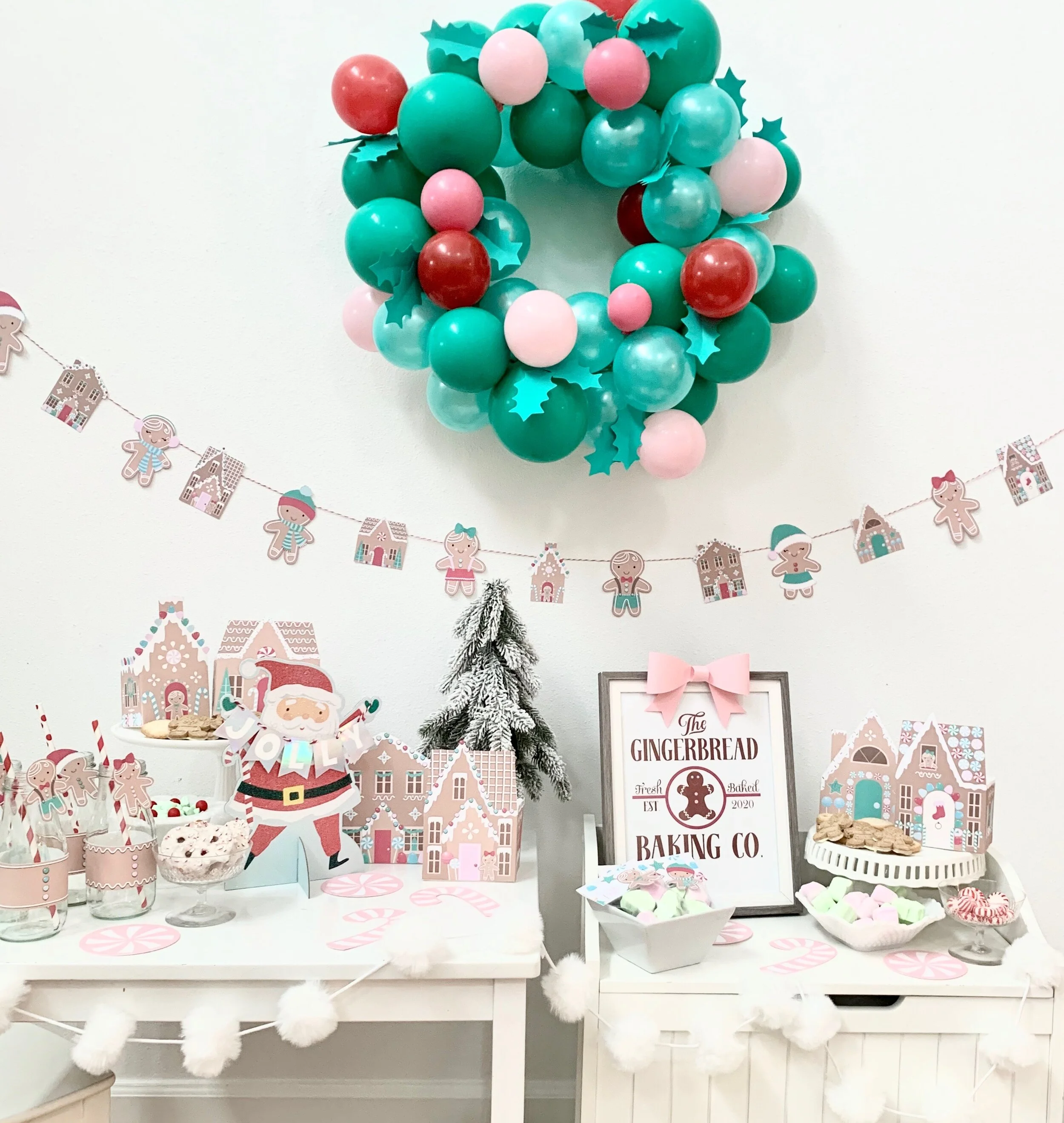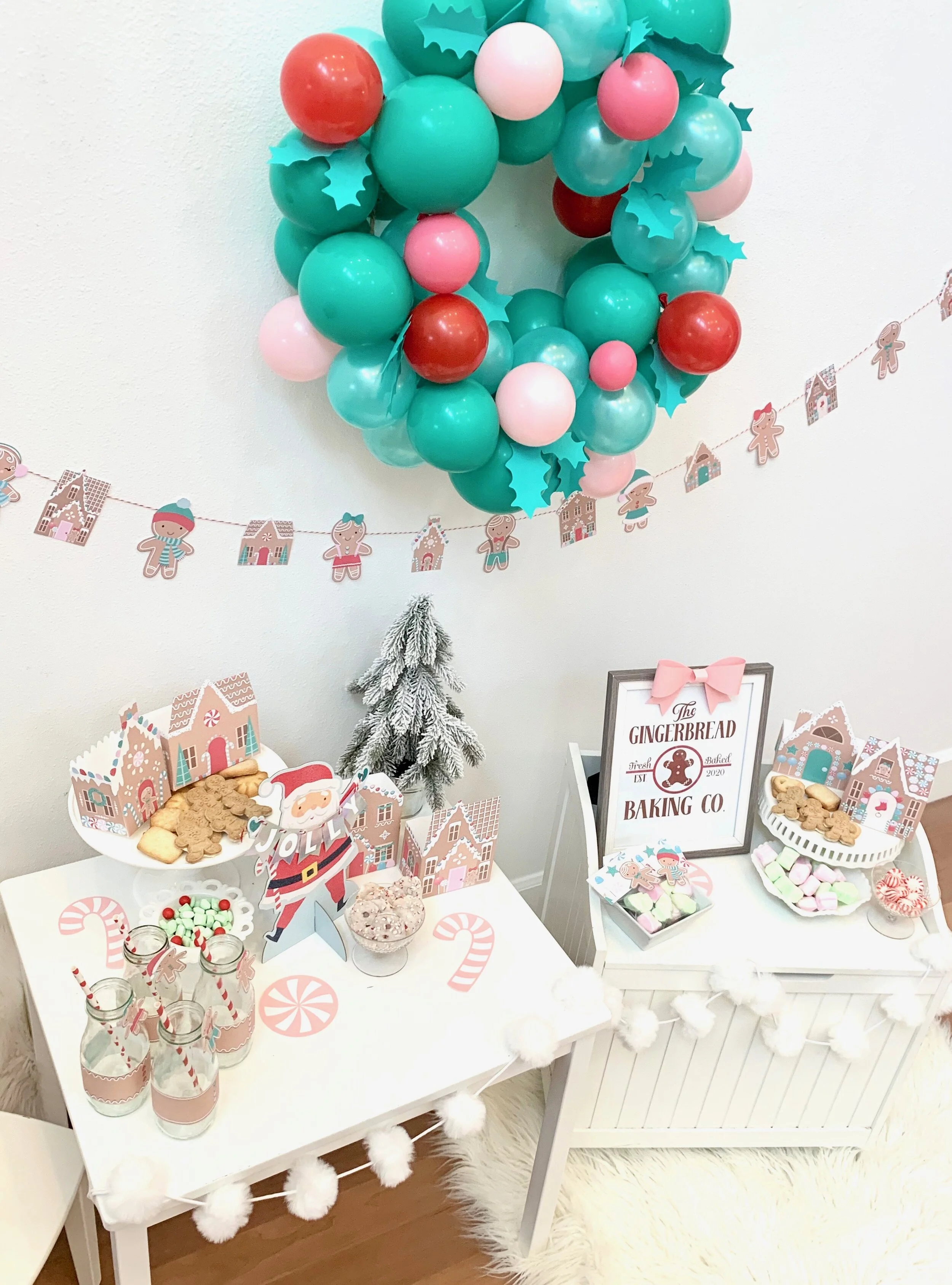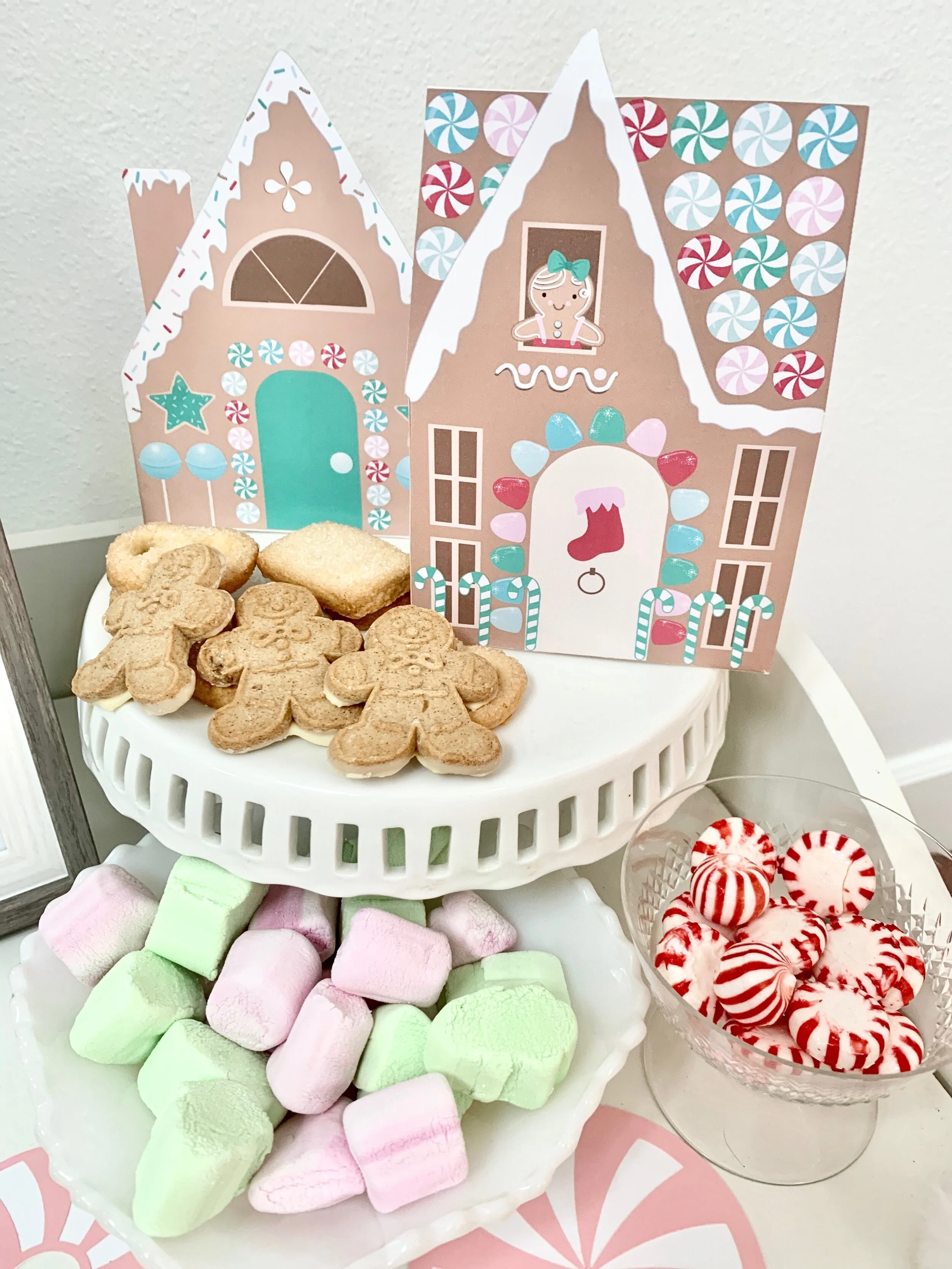 I arranged the paper gingerbread houses with some white and glass cake stands and candy dishes and they set a sweet and adorable tablescape. I added a faux flocked mini tree and white furry ball garland and Pillowfort brand faux fur rug all from Target to add a little texture to the party set up. The Santa “jolly” centerpiece was an adorable Walmart find for just a few dollars.