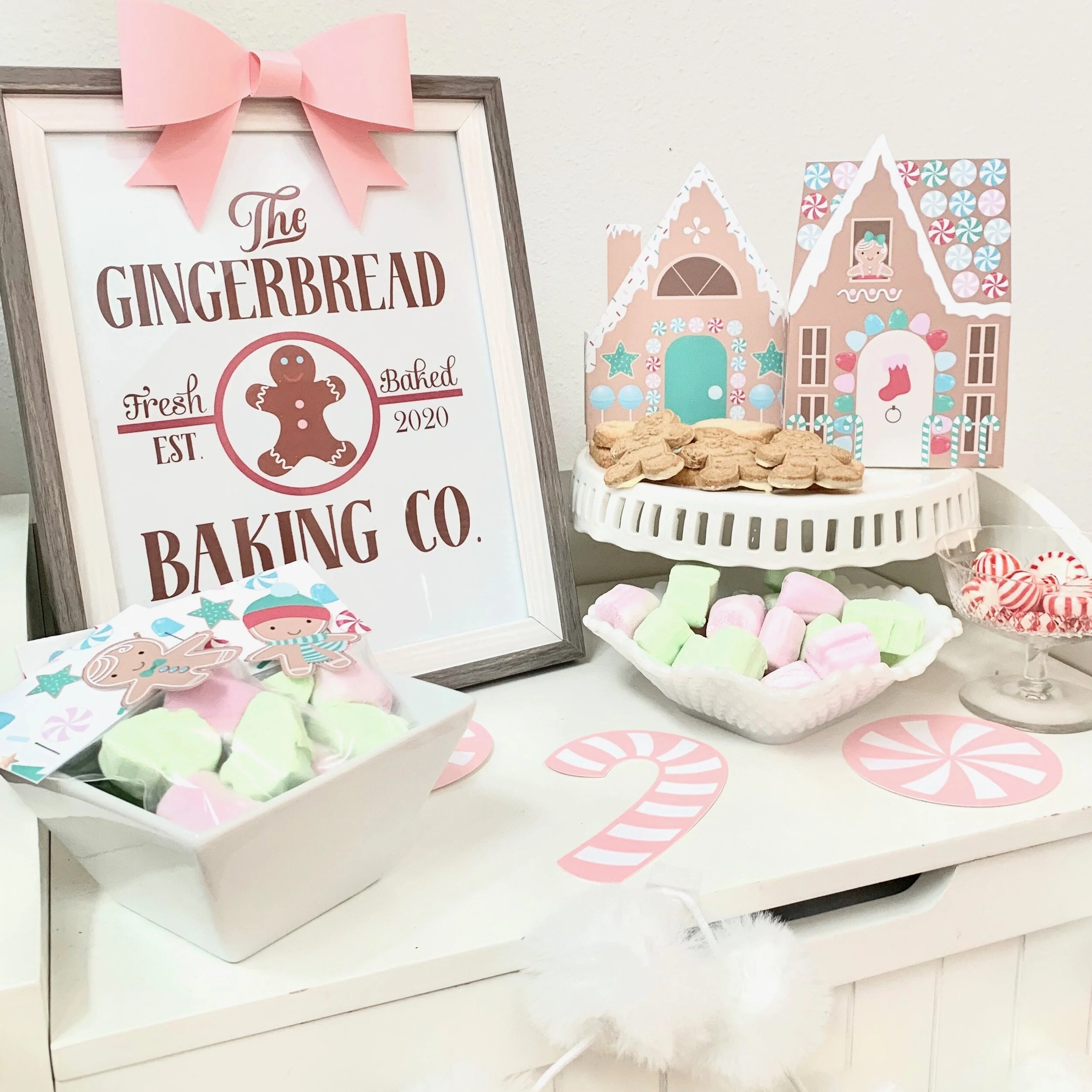 My five year old son’s favorite color is pink! He says it is the “yummiest color,” and since pastels are on trend right now, I thought incorporating a soft pink into the holiday decor would be something he would love. This adorable gingerbread printable collection from Nestling Designs on Etsy caught my eye right away. I like the colors included in this design and that is adds the light light blue, and pink with wintergreen, red and white.