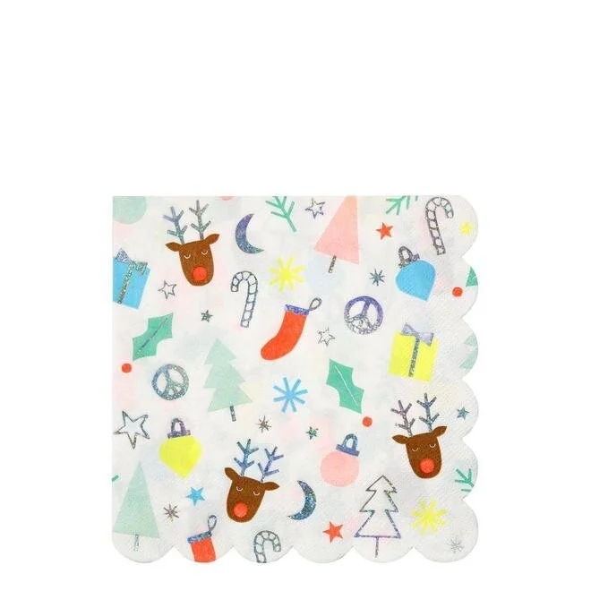 A fun way to make a big impression is in the place settings. We love to mix and match designs to add some dimension. We found the festive plates and cups at Daydream Society, a wonderful company that collaborates with independent artists to create the designs, which we love! As for the Reindeer Christmas crackers, napkins and gold Reindeer plate used for decor on the backdrop were purchased from Meri Meri, our favorite spot for the most adorable party supplies. The cutlery is reusable and found at Sophistiplate. We have linked all of the supplies used below to help you find everything needed to create this set up easily.
