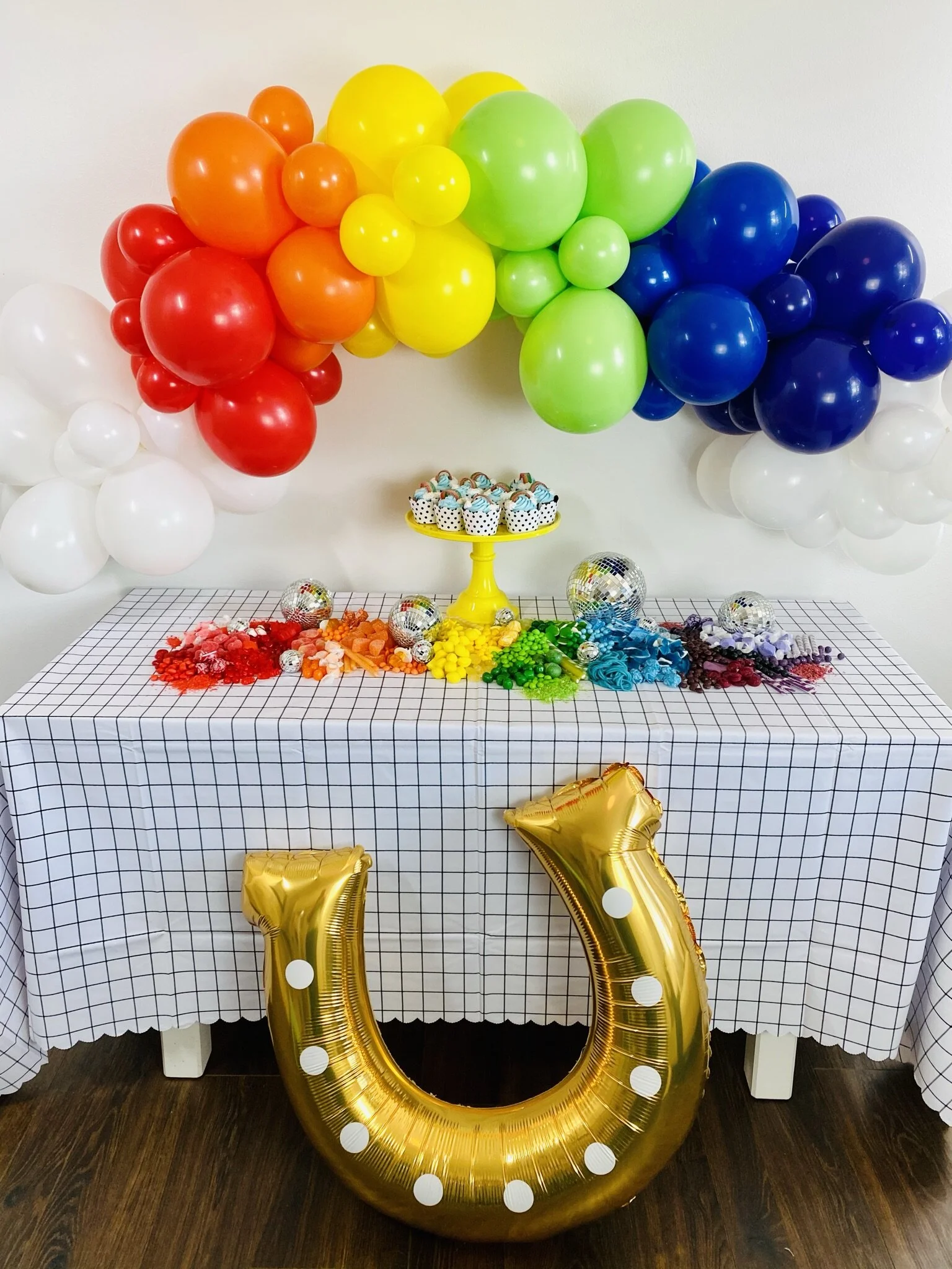 For the balloon garland I purchased the carnival assortment of Qualatex balloons in both 5” and 11”. I also used simple white balloons in 5” and 11” for the clouds at the base of the rainbow.